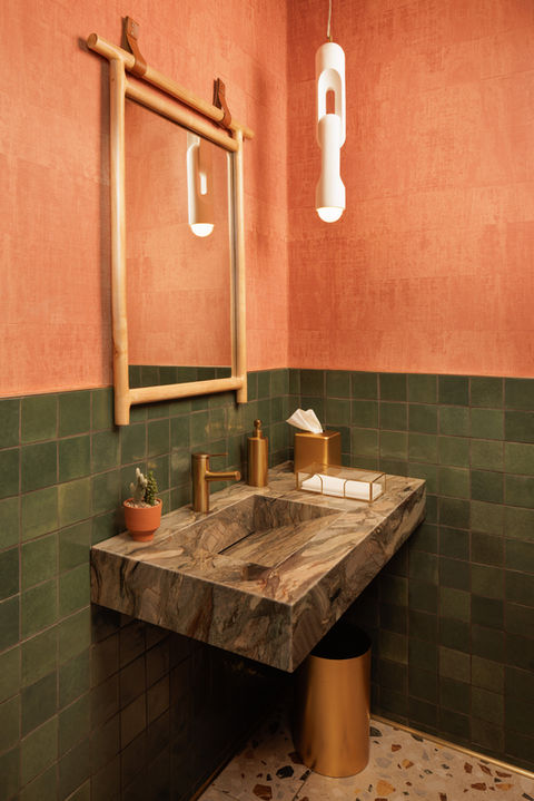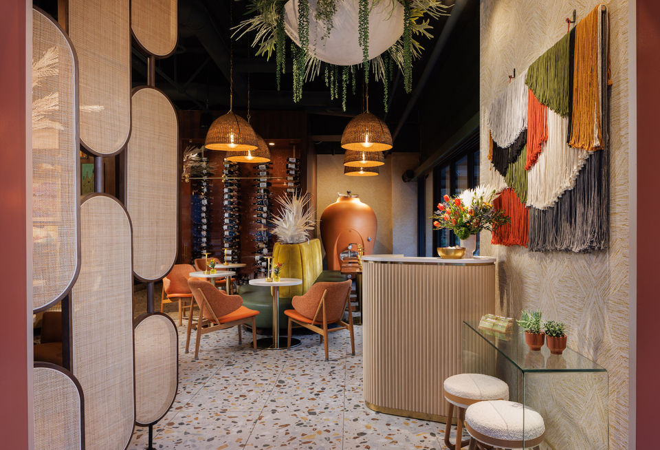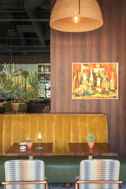 This vacant space in a modern building downtown required a complete reworking and reimagining in order to create the first luxury wine lounge in Palm Springs. With the concept of creating a ’wine oasis’ in the desert, the centerpiece of our design is really the mural behind the bar, depicting a desert garden. The colors we deployed all blossom from this mural --cactus greens, agave blues, the deep reds and vibrant yellows of succulent flowers, and the rich terracotta of earthen clay. Our team designed custom banquette seating inspired by midcentury style icon, Vladimir Kagan. The upholstery features sinuous curves, inviting guests to nestle in and relax. A canvas palm tree bursts to life out of the central seating area, reinforcing our ‘oasis’ motif and providing a literal canopy. White plaster chandeliers in the shape of cactus float over the bar. Underfoot, porcelain tiles with a terrazzo pattern reinforce the midcentury modernism for which Palm Springs is famous, while rich walnut paneling wraps two walls of the space. Vintage wine-themed artwork is sprinkled throughout, adding a touch of nostalgia, alongside artwork from Christopher’s own collection for Wendover Art Group. Another focal point of the space is the terracotta-hued wine amphora, in which our proprietors are making one of the only vintages to be finished and bottled in Palm Springs.